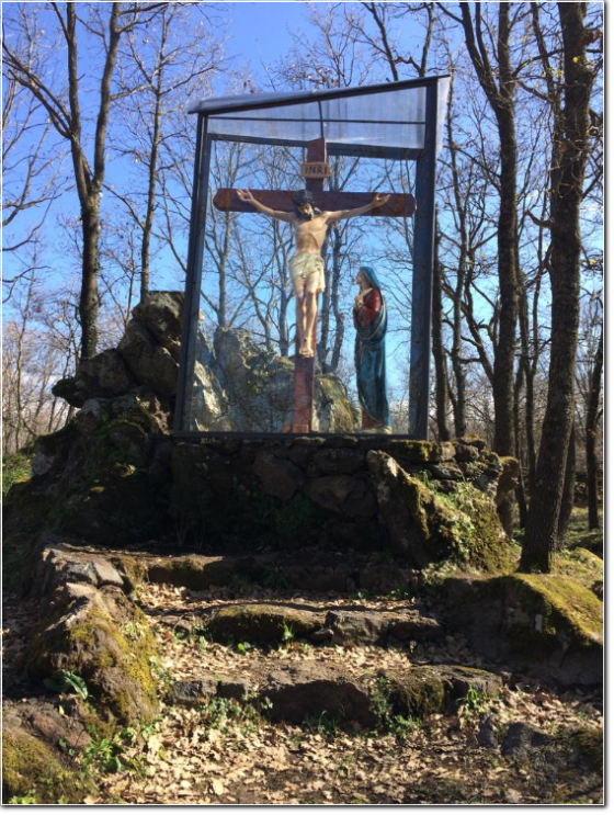 Realizzata grazie al generosissimo contributo economico e ai suggerimenti del Prof. Don Santino Spartà, che l’ha offerta “in memoria dei genitori”, l’artistica Via Crucis si snoda attraverso un lungo percorso tra gli alberi che, partendo dal lato destro della Cappella di Nostra Signora di Fatima, diventa via via una “Salita al Calvario“ della XII Stazione, dove troneggiano le statue a grandezza naturale del Crocifisso e della Vergine Addolorata. Le formelle della Via Crucis, realizzate dalla scultrice romana Anna Maria Borsatti, sono incastonate nelle 15 rocce laviche che formano le varie Stazioni. Davanti ad ogni stazione è stato posto un molteplice impianto elettrico che si accende automaticamente al tramonto per spegnersi all’alba o che, attivato dalla centrale, illumina a giorno tutto il complesso religioso. A custodia del tutto è stato realizzato un sofisticato impianto di sorveglianza con 12 telecamere che registrano 24 ore su 24. Infine, per proteggere le formelle e le statue dalle intemperie, sia le formelle delle stazioni che l’intero Calvario, sono state protette con solido vetro antisfondamento.